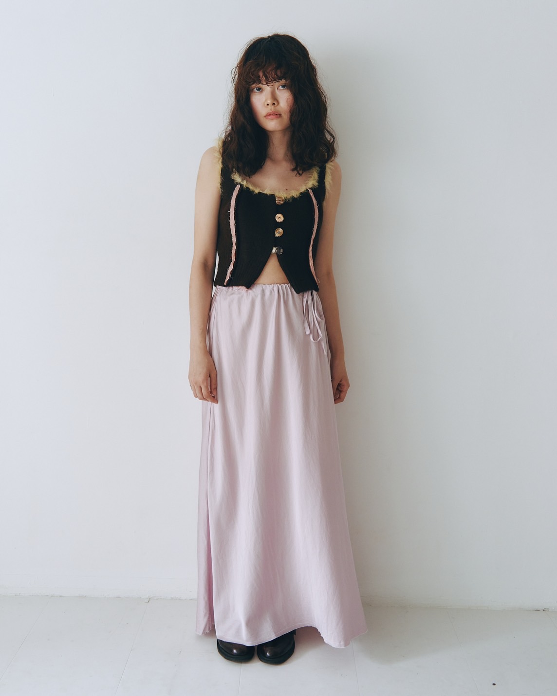 ウエストに紐が通っていて、食べすぎたお腹に合わせて着心地も調整できるし、なによりこの気まぐれにぶら下がっている紐がスタイリングのワンポイントです。