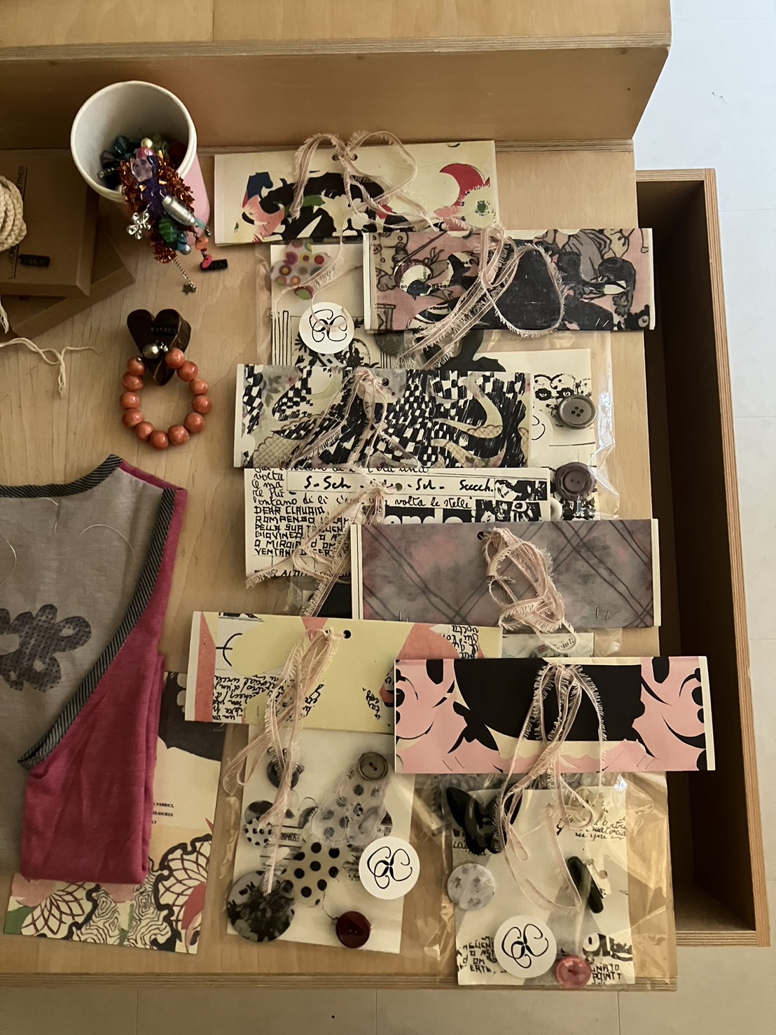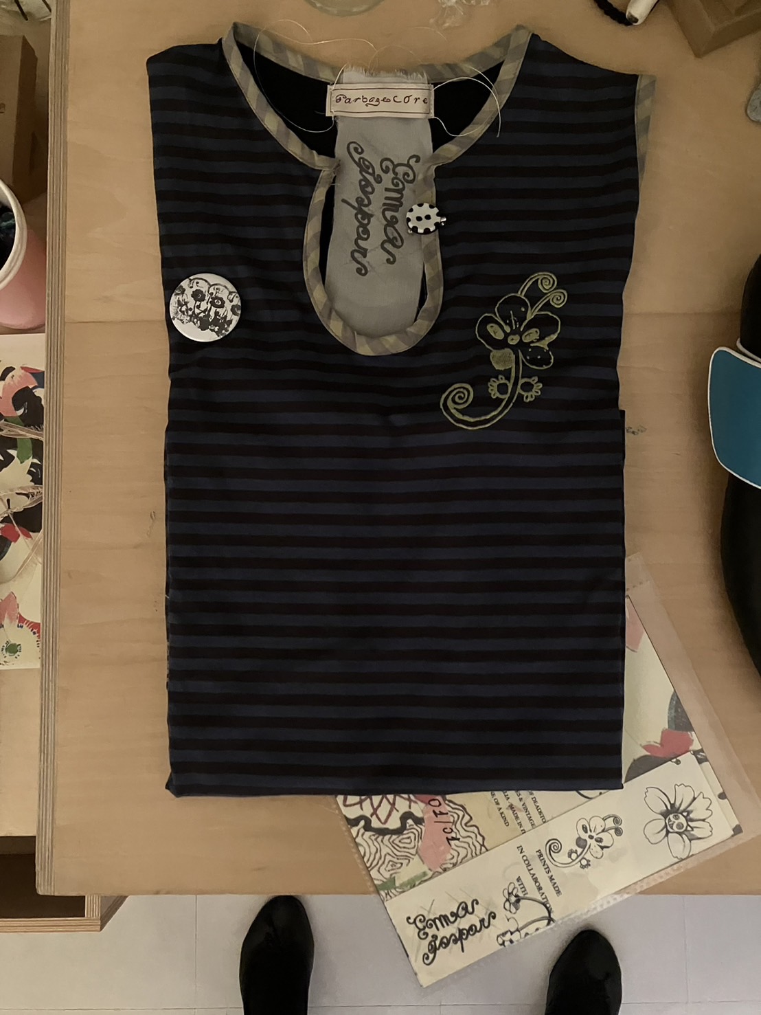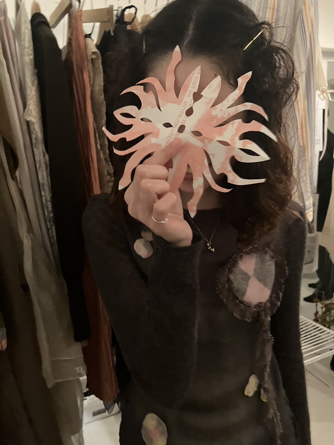 布や紙をミックスして作られた切り絵のアート作品や、紙を使って作ったオリジナルグラフィックアートがピン、服やバッグの柄になっていて、一着の中で小さならくがきのように添えられたデザイン。ムードをそのまま反映させたようなデザインでとても良いです。全てのアイテムについているピンは取り外しできるようになっていて、自分の好きな場所に付け替えたり、自分の持ち服に付け替えたりも自由です。そして..