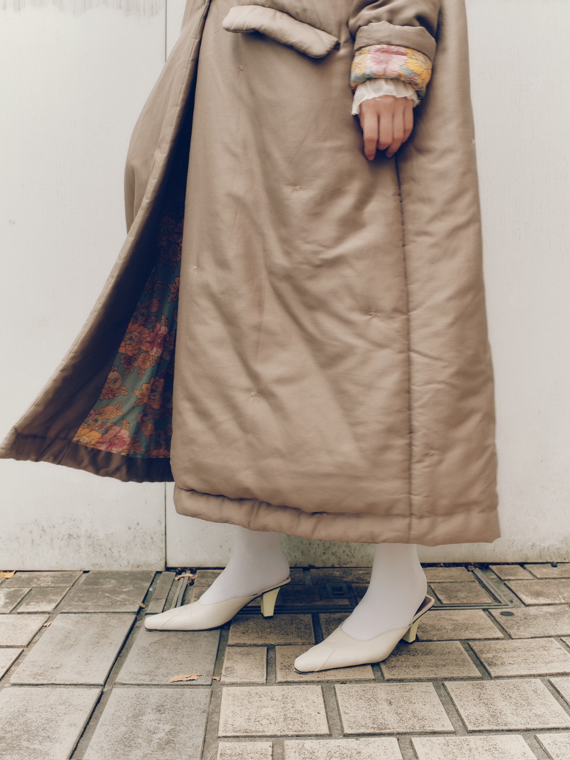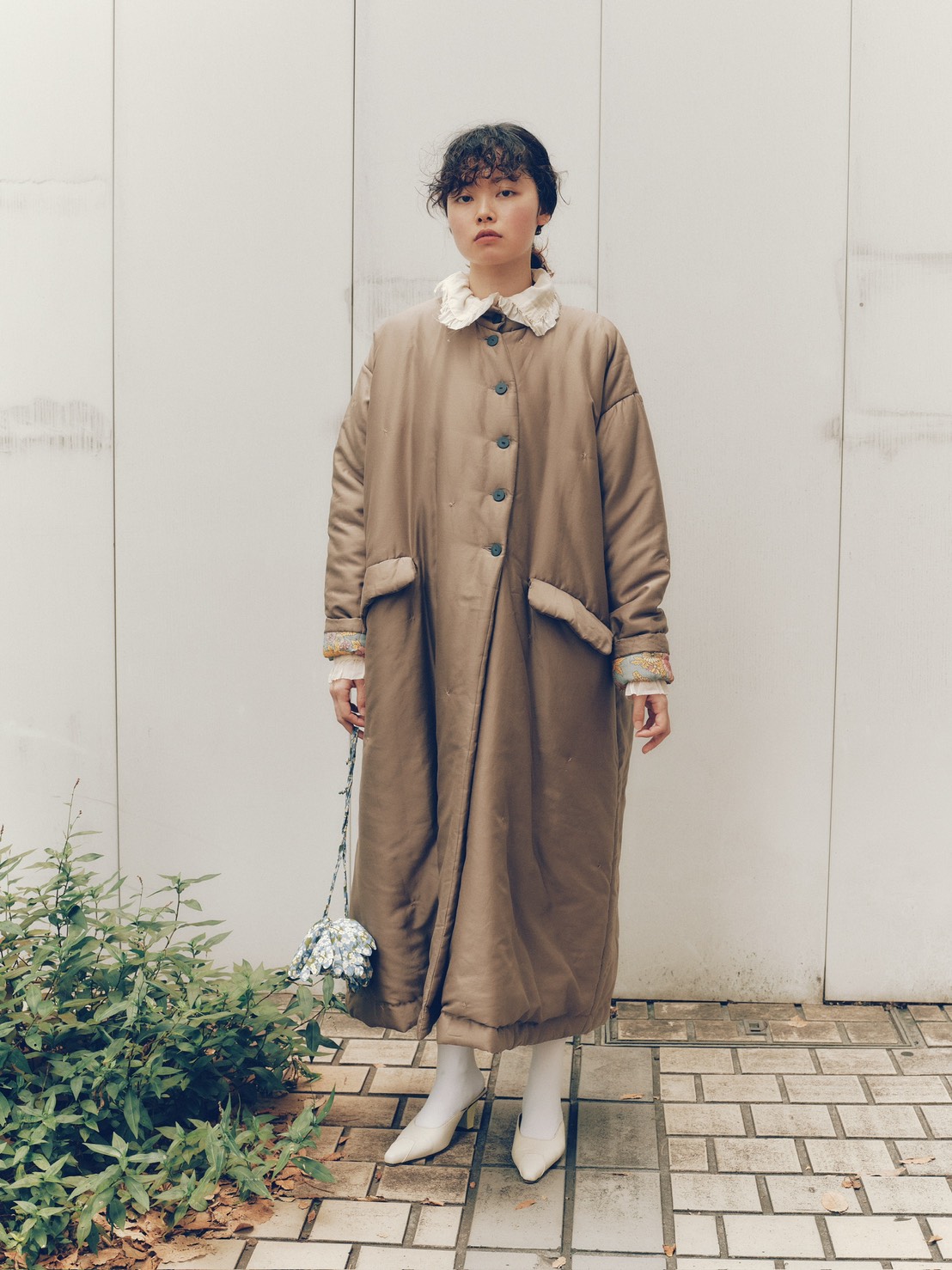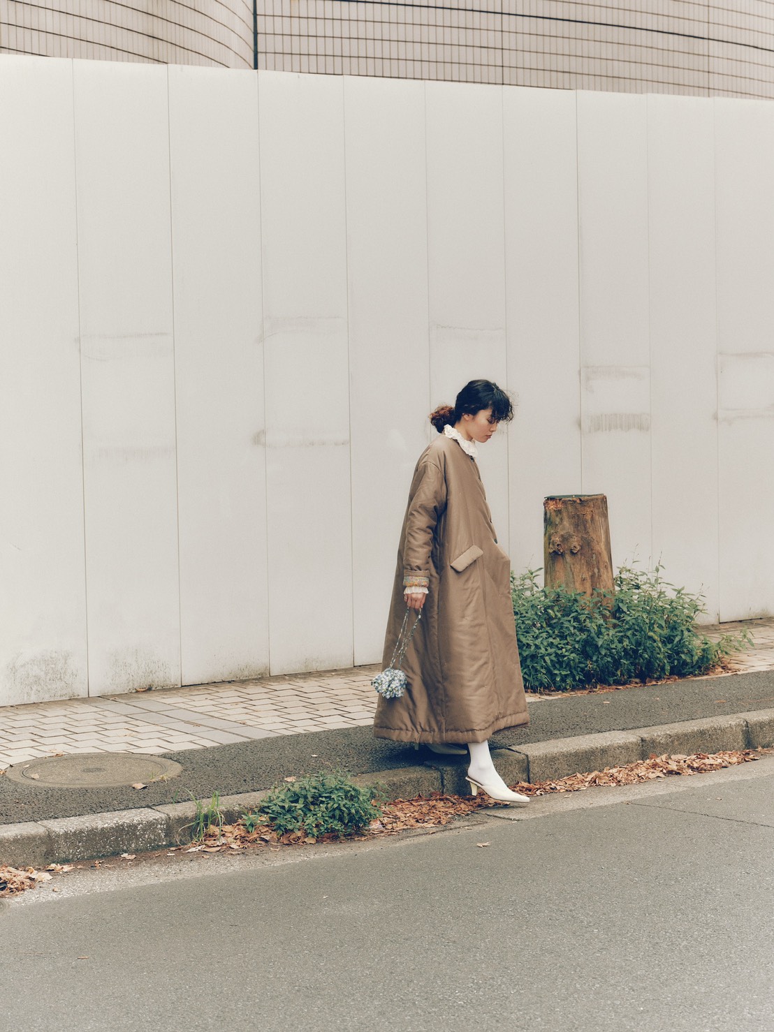 「着る人に寄り添う美しさ、あなただけの秘密の瞬間を創り出す服づくりを大切にしています。cuddle coatの裏地には最も美しい花柄シルクコットンを使用しました。風が吹いて裾がめくれ上がるまで誰にも見えない、明るく陽気な花々が隠されています。ゆったりとしたひととき、袖口の内側を覗き込み、あなただけのためにあるその魅力を再確認する姿を想像します。」