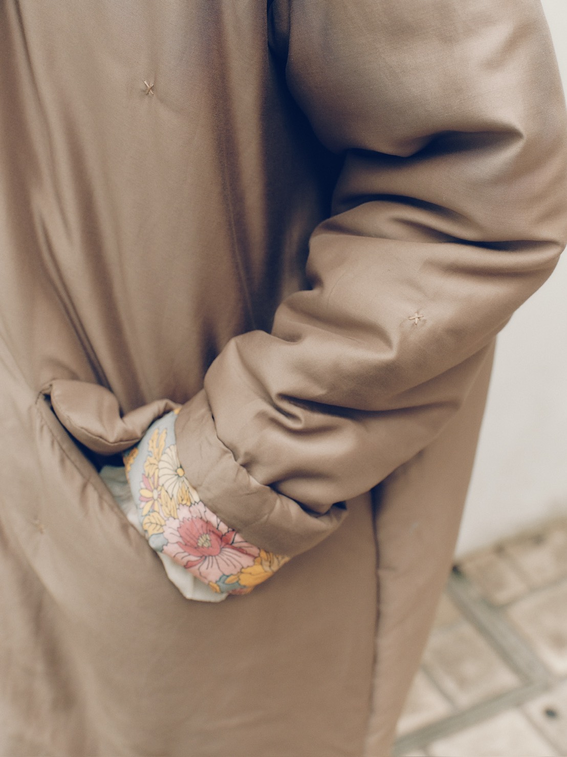 そんなわたしにとって、このコートは本当にときめくデザイン。着ている自分だけが知っている内側の鮮やかな花柄。。街では大人しく振る舞っている人が、家に帰ったらめちゃくちゃおしゃべりになるみたいなかわいさ。