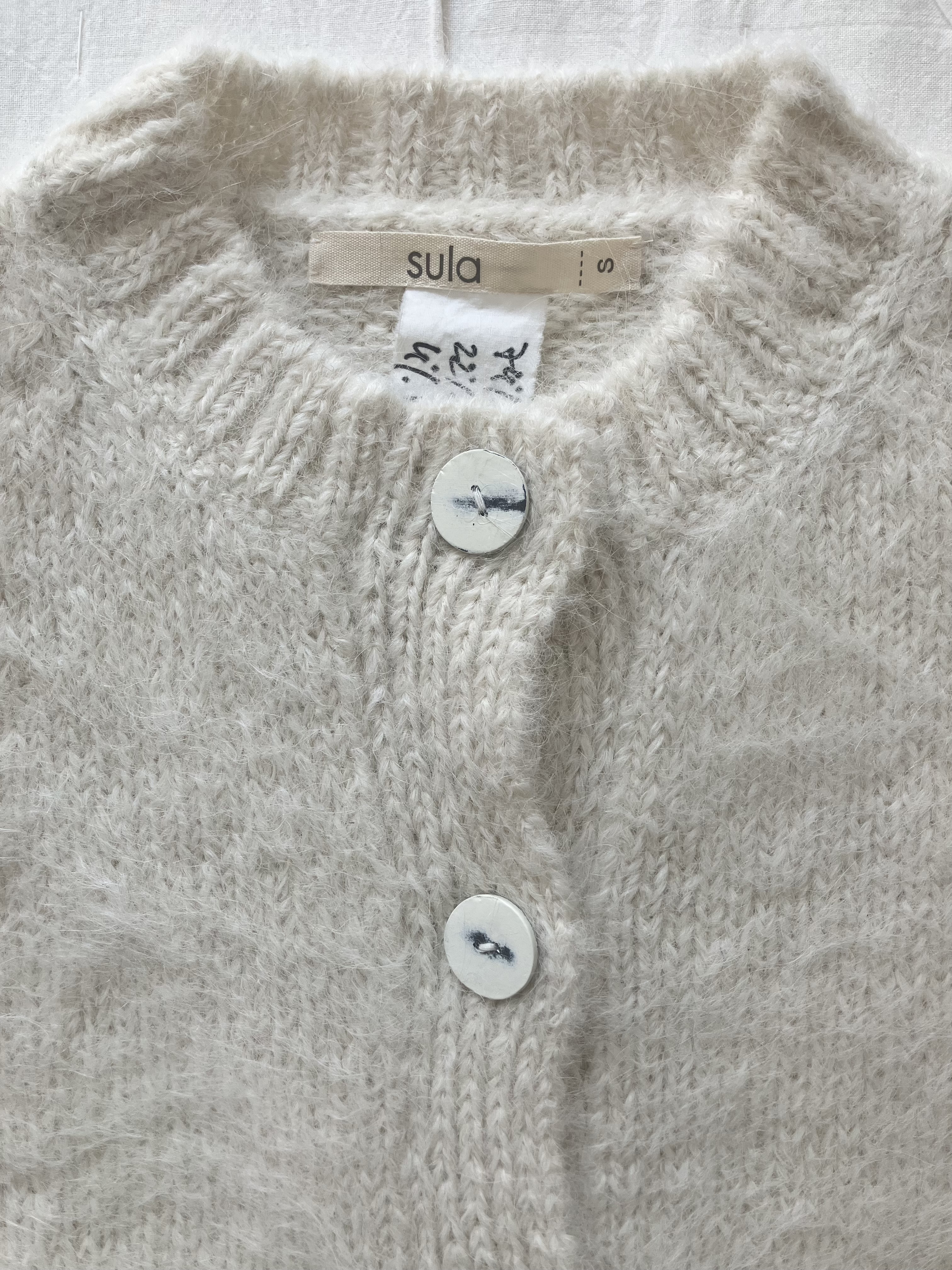 ペルーの職人により一着一着手織り機で編み上げられていて、スリアルパカ、メリノウール、再生ポリアミドの混合素材です。手作りのウッドボタンも、ひとつひとつ異なる表情で、ネイビーの模様?がとってもいいアクセントになっています。