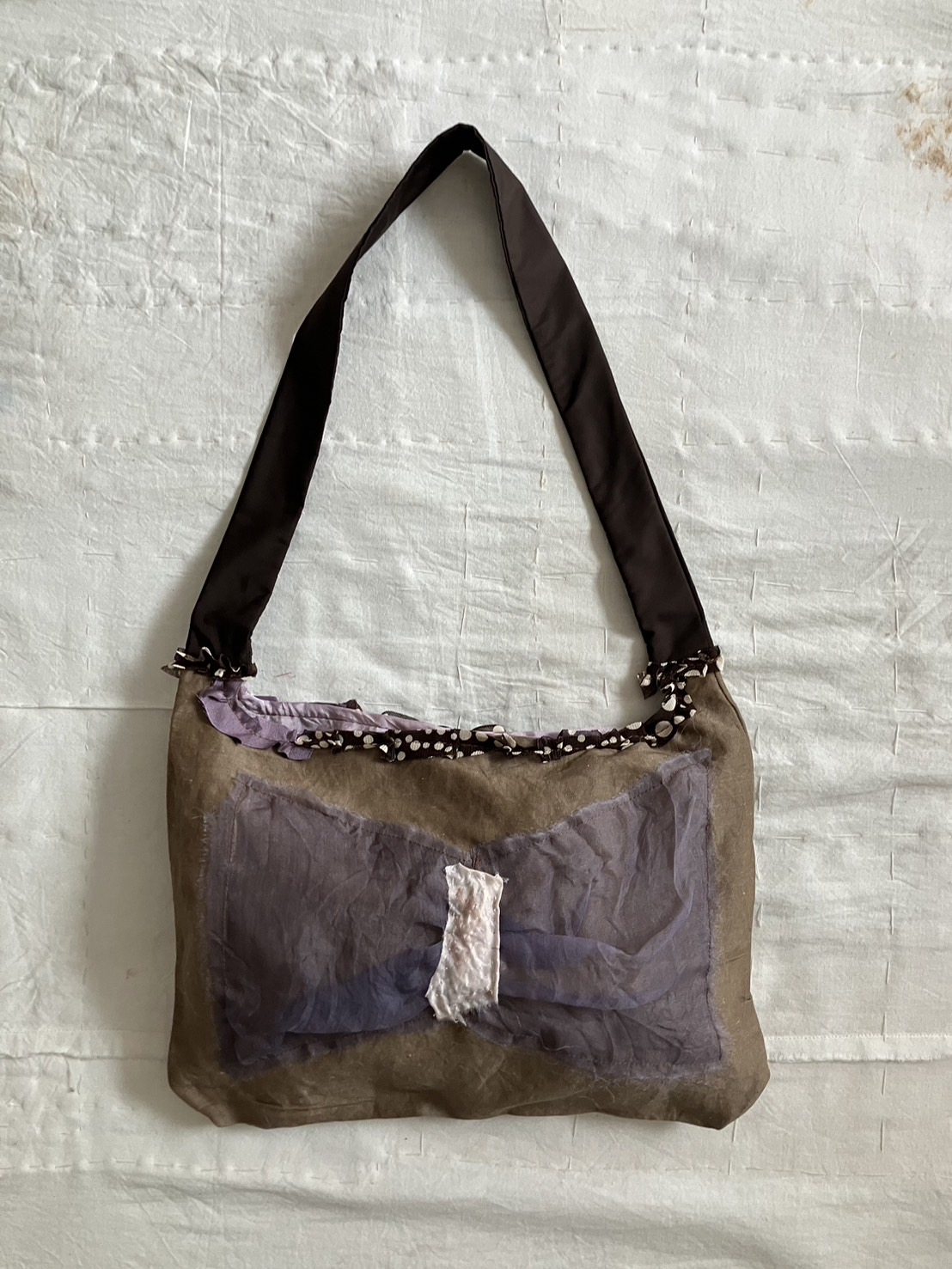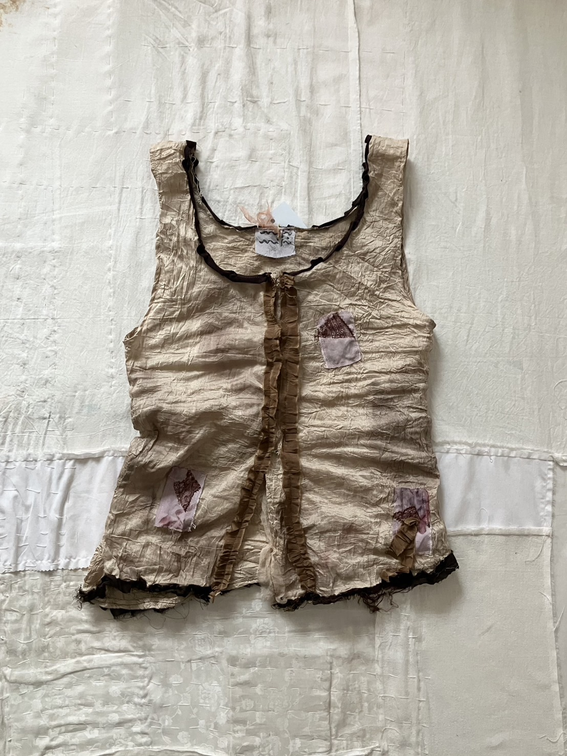 紐を結んでホルターネックにして着るのが主流?なのですが、私は左右の紐を上下で結んでキャミソールっぽく着ています。ホルターネックだと首元がU字っぽくなるんですが、この着方だと緩やかな曲線になって、Tシャツと重ね着した時の見え方がお気に入りです!背中側の肩のところで結ばれるリボンもとってもかわいくて大好きなスタイリングです。おばあちゃんからもらったベッコウのブローチで少しブラウジング。ホルターネックのバランスもまた研究したい!