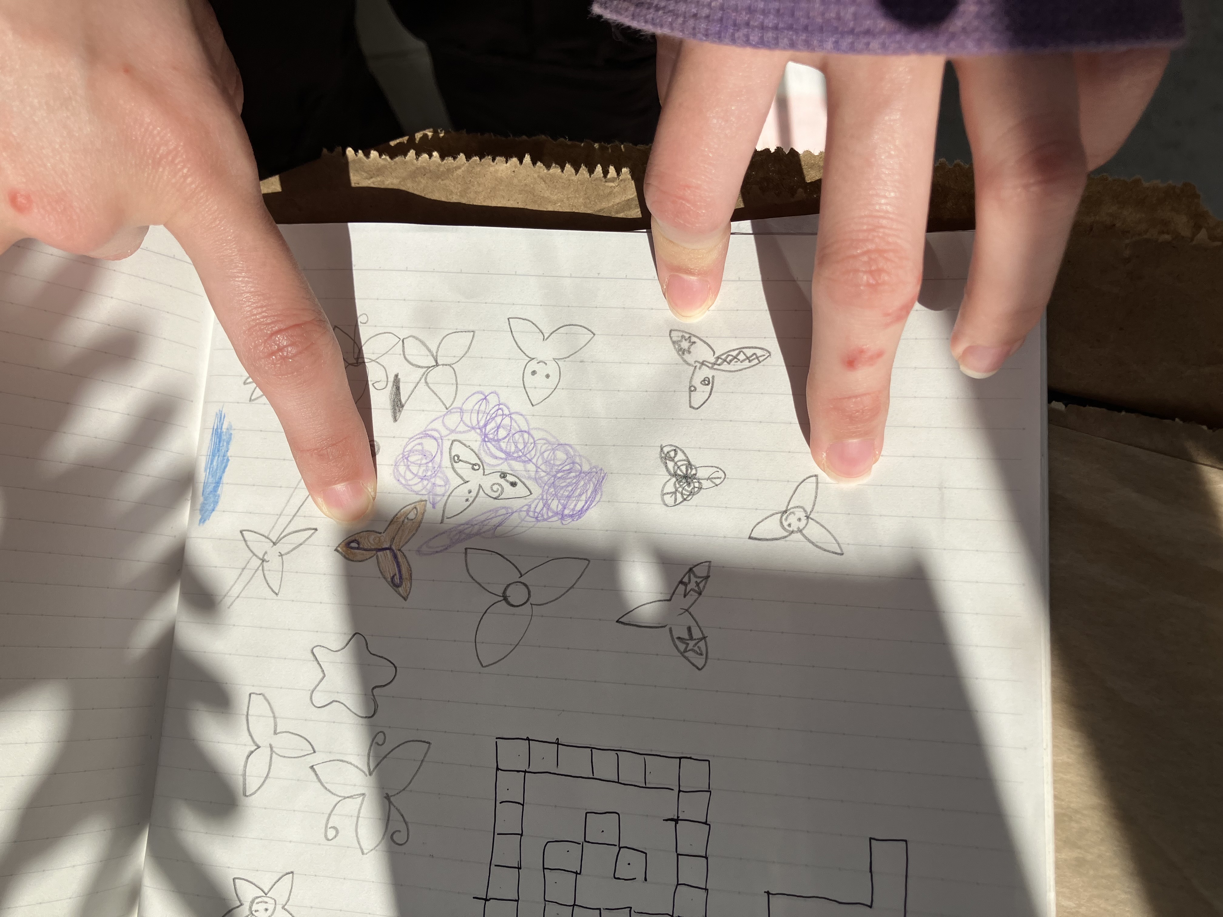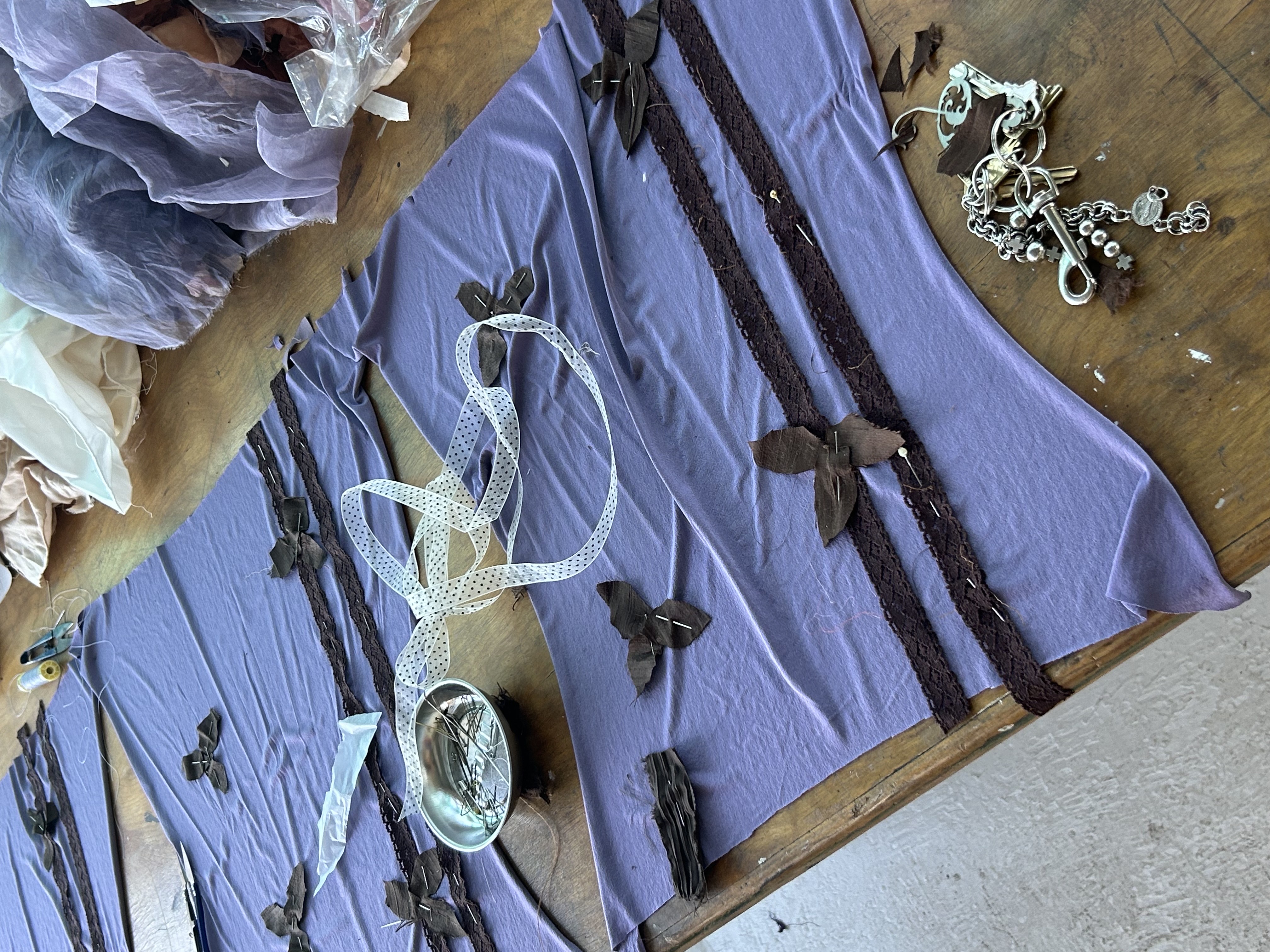 今回、SEASONVOICE をイメージしたというトップスが一つあります。それは、楽譜の上の音符のような、お花のようなモチーフなような。。!音楽とお花、紫とブラウン。そんな組み合わせのトップス。これをイメージに、なにやら游泳のお菓子が計画されているようす。
